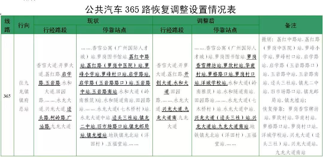 三、公共汽车365路恢复经行开创大道、开源大道、九龙大道南等路段并恢复停靠沿线站点,具体调整见下图。