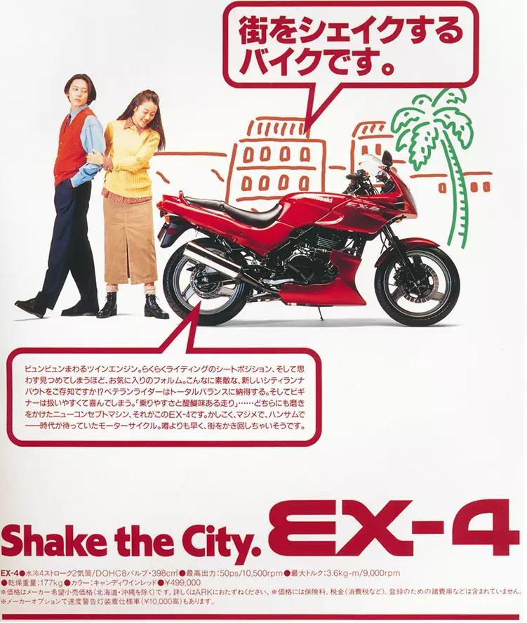 那川崎为什么还要推出EX-4呢?难道川崎不怕重蹈GPZ400S的覆辙吗?其实不然!ZZR400也好,ZXR400也好,这两款车的定位十分明确。或者说有些过于明确了。这两款车的目标用户就是那么一小群。川崎的中排量家族里还缺少一个万金油的车型!