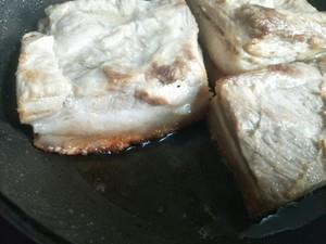 大片五花肉整片植物油少量老抽少量冰糖碎少量不沾平底锅1只