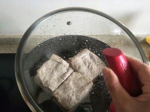 7.把肉放进去,肉皮贴着锅底放置,然后盖上锅盖,再开火(开火炸制过程中严禁开盖)