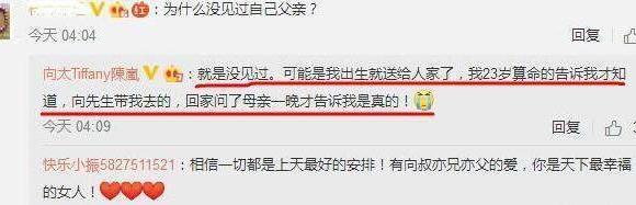 有网友问道:“为什么没见过自己父亲?”向太随即回复:“就是没见过,可能我出生就送给人家了,我23岁算命的告诉我才知道,向先生带我去的,回家问了母亲一晚才告诉我这是真的!”