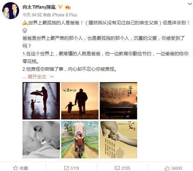曾经有一次父亲节,向太发文说:“世界上最孤独的人是爸爸,虽然我从没有见过自己的亲生父亲!”