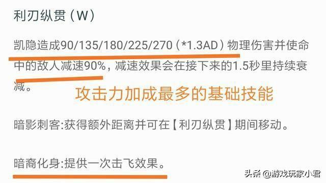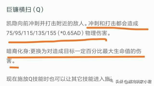 凯隐的Q技能是他的主要输出技能,并且在变身为暗裔化身后技能能更换为对目标一定百分比最大生命值的伤害,具体值为67+6%目标最大生命值(+0.55总攻击力)的物理伤害。