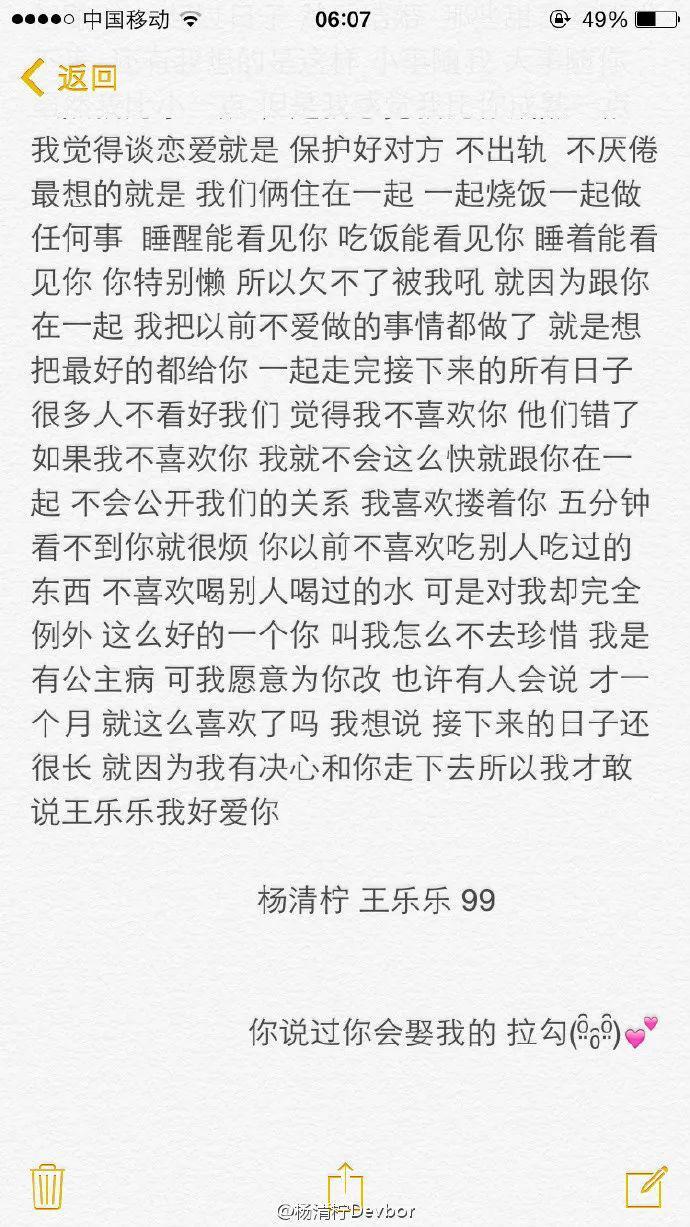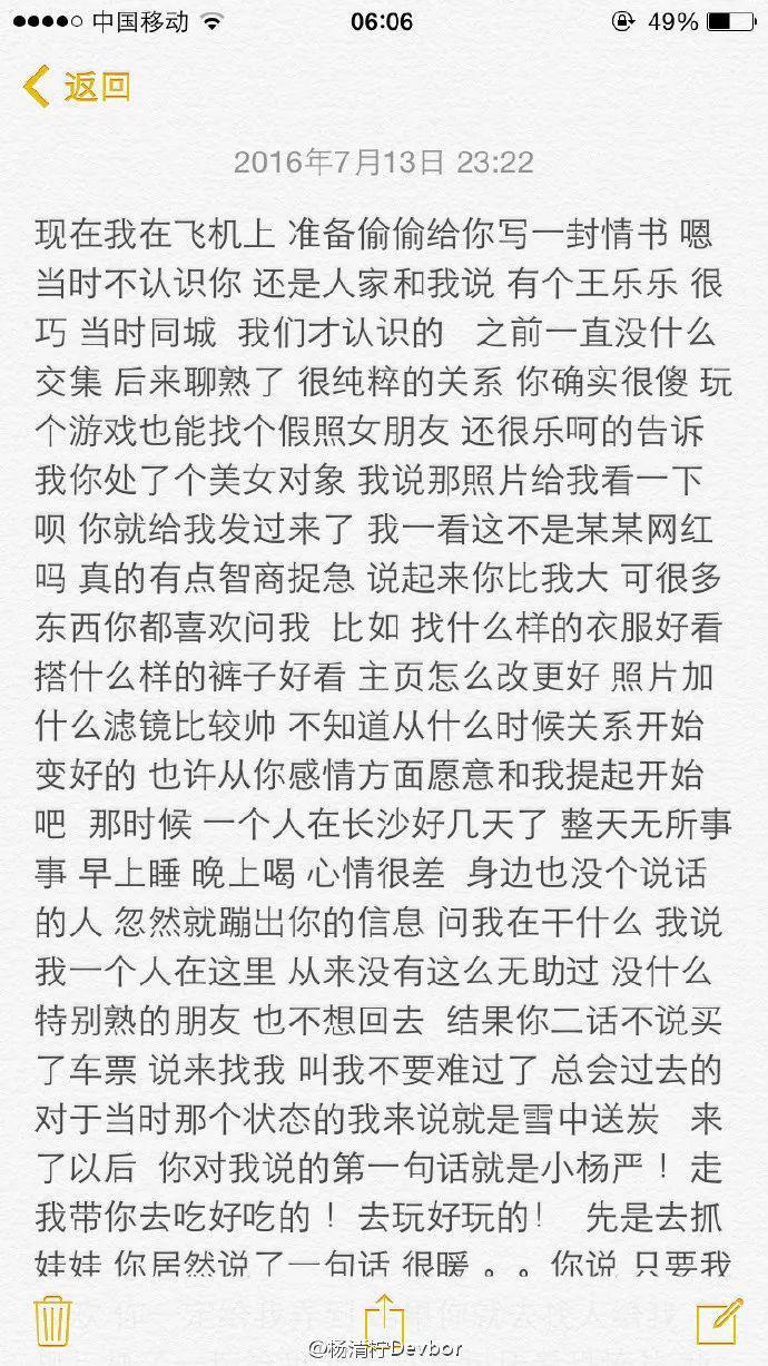 杨清柠 7 月 15 日在微博发文:" 辛辛苦苦写的 希望得到你们的祝福 也希望你们好好看完。曾经我有多喜欢你 只有我自己知道 现在我有多爱你我想让全世界都知道 一起好好走下去吧 王乐乐 @好玩的王乐乐 " 在微博中有写说跟前任分手是种种原因,那段时间和难过,都是王乐乐陪她的,她很感动。