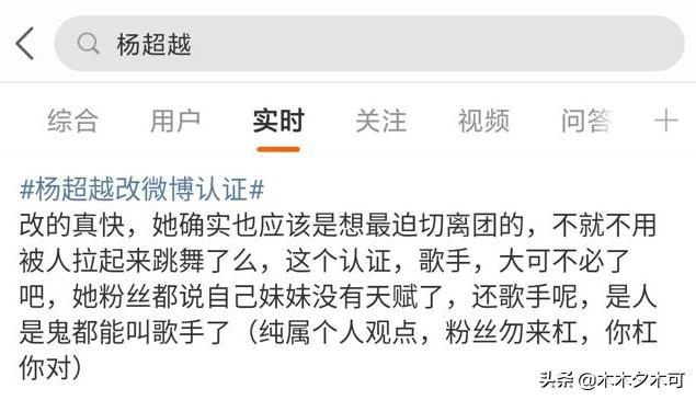 而且杨超越也是11位姐妹中第一个更改微博认证的人,现在认证的是歌手,演员杨超越,不再是火箭少女101杨超越了,只不过这一举动又引来了大部分网友的吐槽:现在随便一个人也能自称歌手演员了,门槛真低。