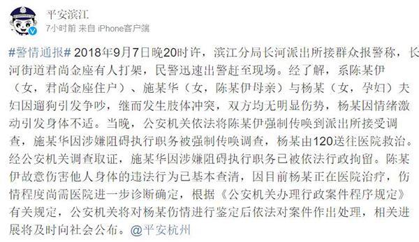 今天凌晨,警方通报称,陈某伊故意伤害他人身体的违法行为已基本查清,其母亲因涉嫌阻碍执行职务已被依法行政拘留。