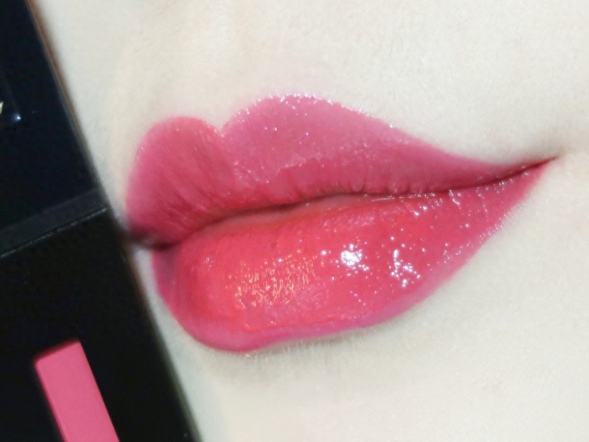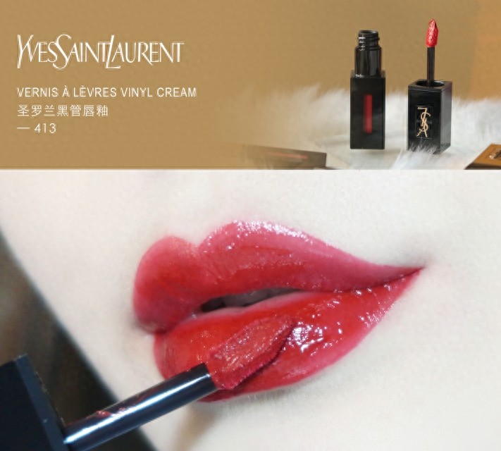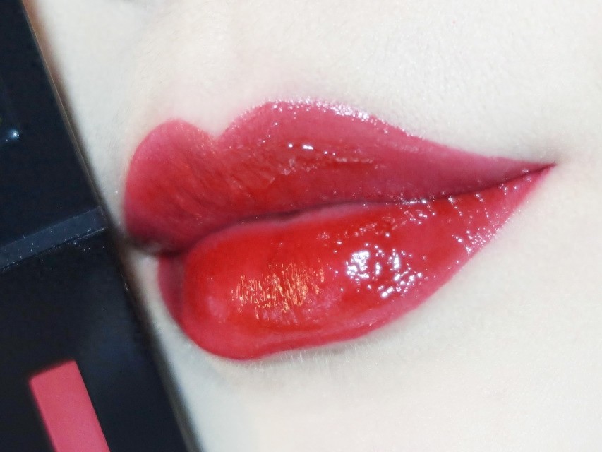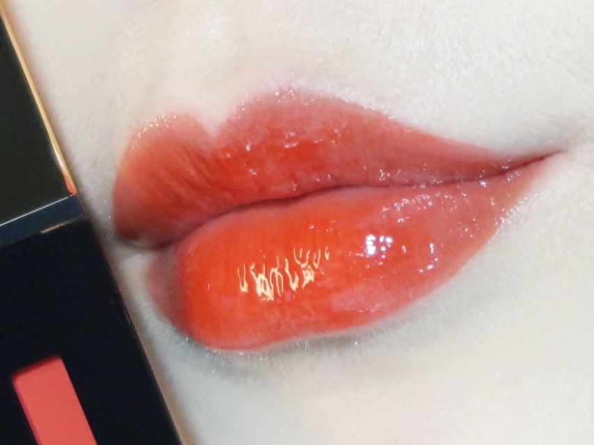 左边两个大家都很熟悉,两个系列靠logo底色来区分。金色是经典款的YSL纯色唇釉,上唇是漆光效果,表面亮润,饱和度中等。银色是水唇釉,简单说就是打造水润妆效。