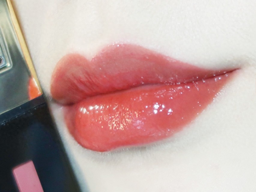 通透的唇妆效果,饱和度低,上唇细腻水亮。