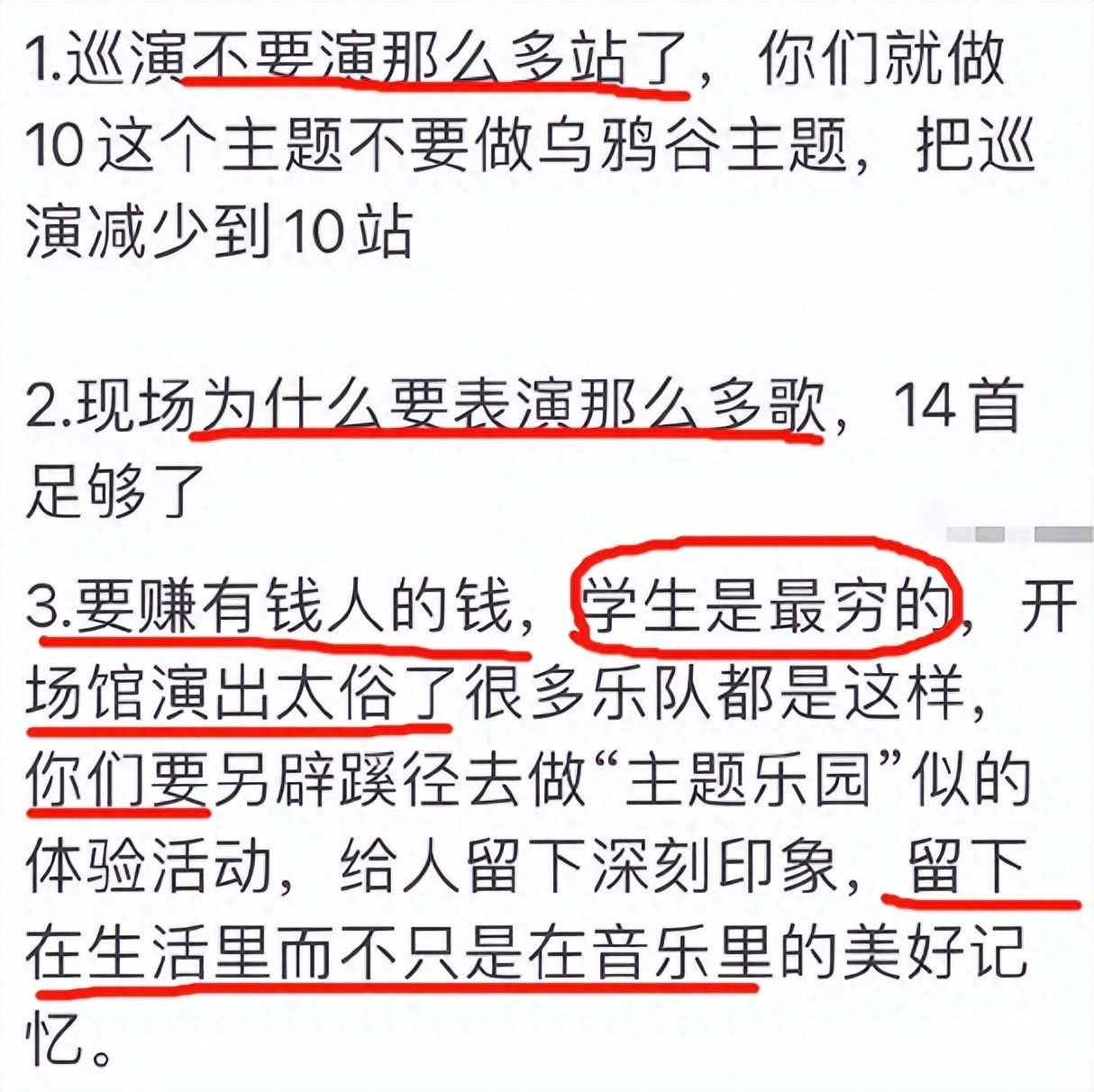 其次,乐队从零几年一步步拼到乐夏决赛舞台,拼到国外巡演,拼到国内头部音乐节主舞台,凭什么要减少演出,减少表演内容?成员之间十几年的友谊,怎么可能因为一个不知道哪里来的外人几句莫名其妙的“建议”而受到影响?