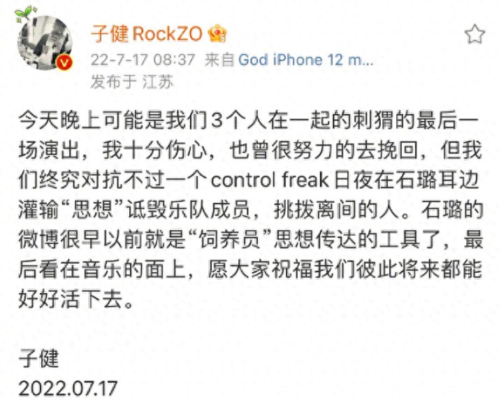 这也与子健前文"control freak"的指责十分吻合,甚至把乐队成员踢出了石璐粉丝群,控制欲占有欲扑面而来。