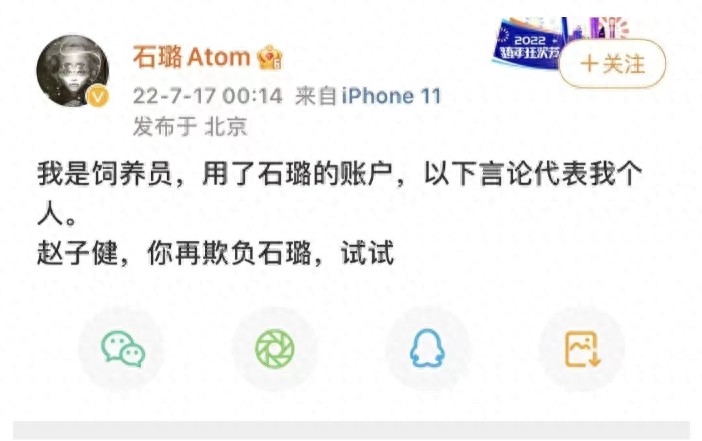 这件事情的起因,一个叫“饲养员”的人,也就是刺猬乐队鼓手石璐现男友,在微博上博同情,直接点名子健。