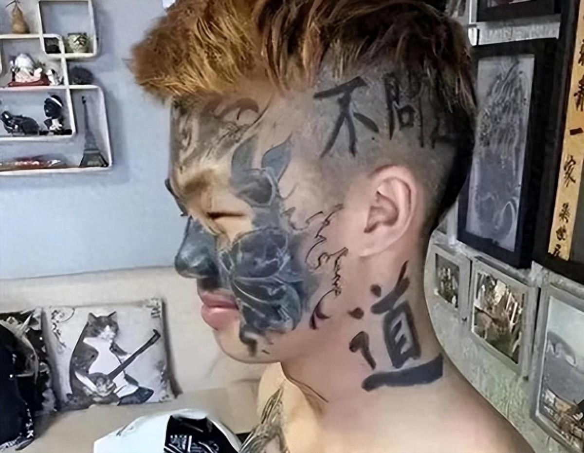 短短两个月,夏朝勇的整张脸就被各种杂乱的图案覆盖。这些纹身技术粗糙,有些地方甚至感染发炎。等到店主玩腻了这个"实验品",就把他赶了出去。
