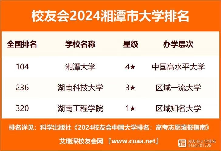 在高校排名方面,2024 年软科高校排名中,湘潭大学位列第 102 位;在校友会高校排名中,湘潭大学位列第 104 位。录取分数线在湖南省内也位居前列,吸引了大批优秀学子报考。