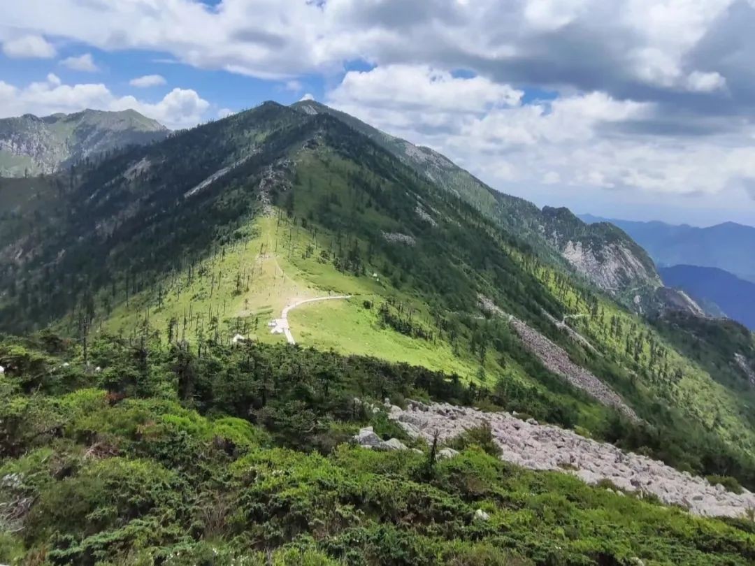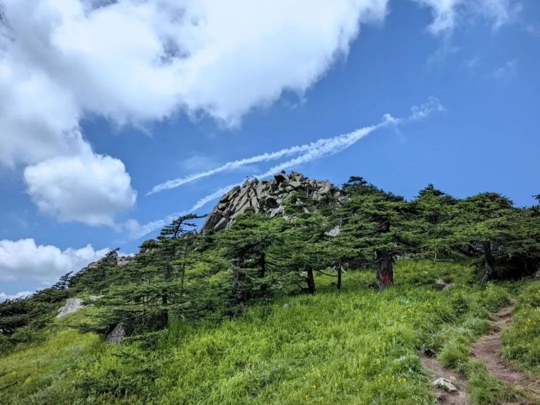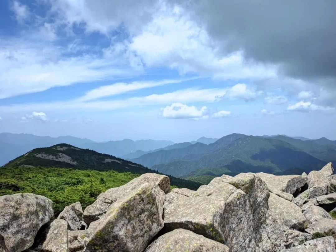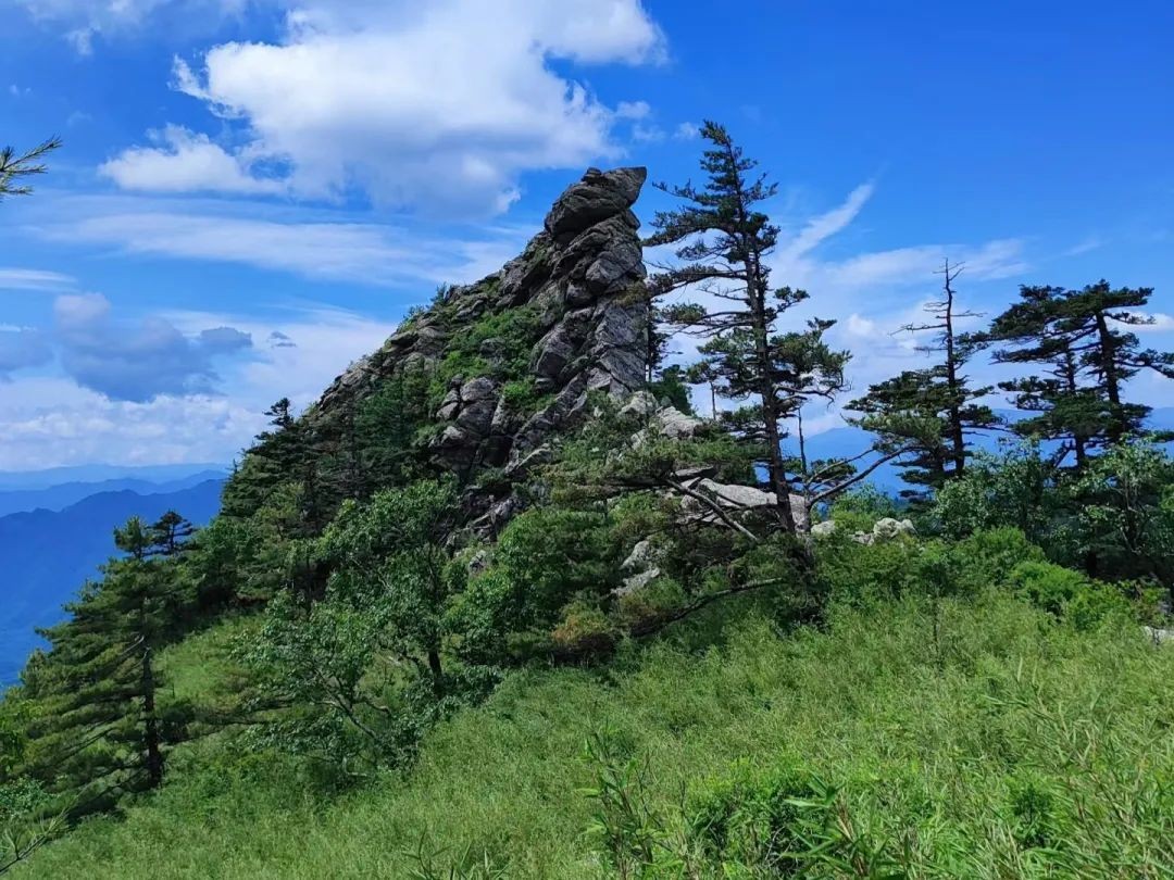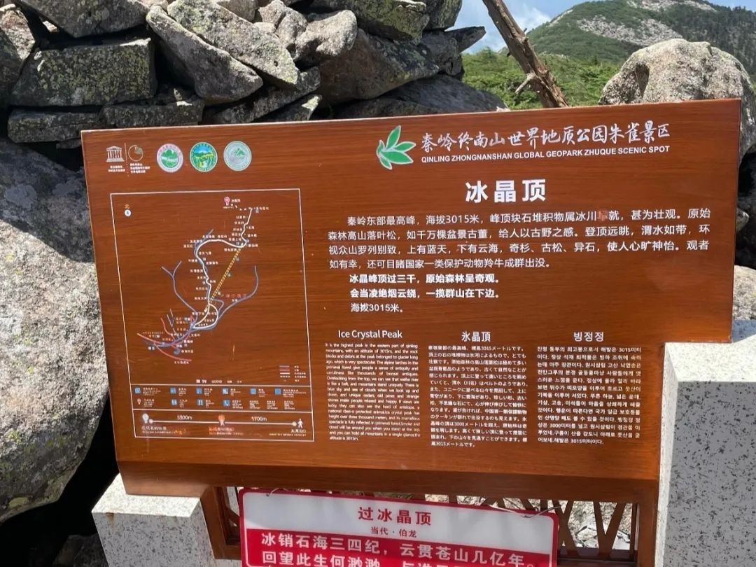 山顶有大面积石海,是典型的冰川侵蚀地貌,也是秦岭地区冰川遗迹的代表之一。石块形态各异,大小不一,在阳光下闪烁着银色光芒,如冰晶般璀璨,故而得名冰晶顶。
