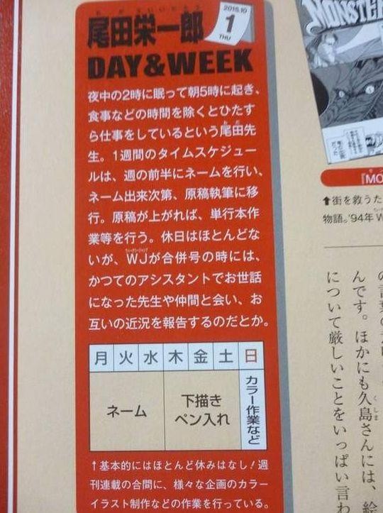 多年以后,现在已经44岁的尾田,最近又曝光了他的工作日程安排表,这次对待工作更加变本加厉了。星期一至星期三创作漫画的分镜,星期四到星期六完成漫画的草稿以及对漫画描线,星期日还要对漫画进行上色等工作(完全没有了休息时间)。也许在尾田的世界里根本就没有法定休息日这个概念,每天都在笔耕不辍地创作漫画(以后再也不催更了,心疼尾田大神~)。