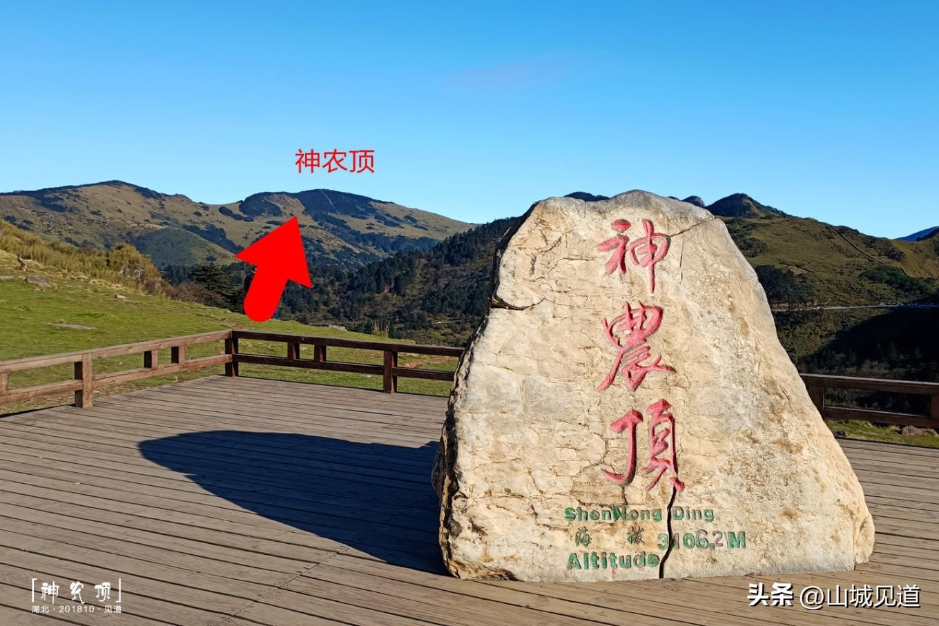 1、在平台上有个神农顶海拔高度石碑,可在此以远处的神农顶山峰为背景打卡留念。