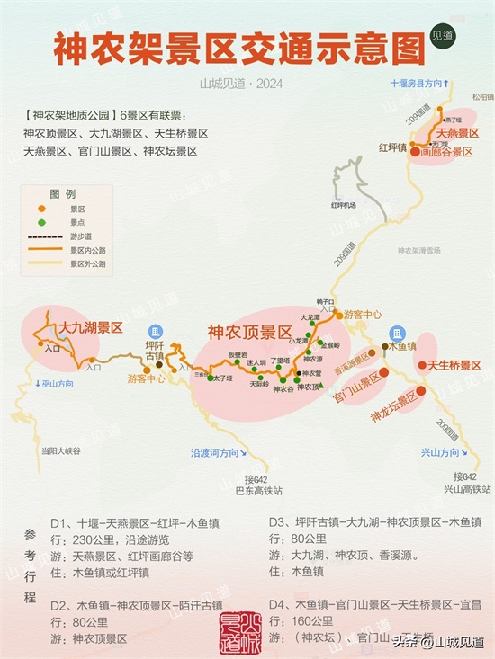 神农架各景区大部分都分布在209国道等主公路两侧,自驾游比较方便。天燕景区在比较偏北的位置,其它多在木鱼镇附近。