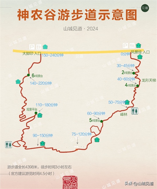 神农谷步道呈U形,全程4.4公里,海拔落差258米。走完全程大约要三四个小时,强度非常大。体力欠佳及时间有限者,慎行。