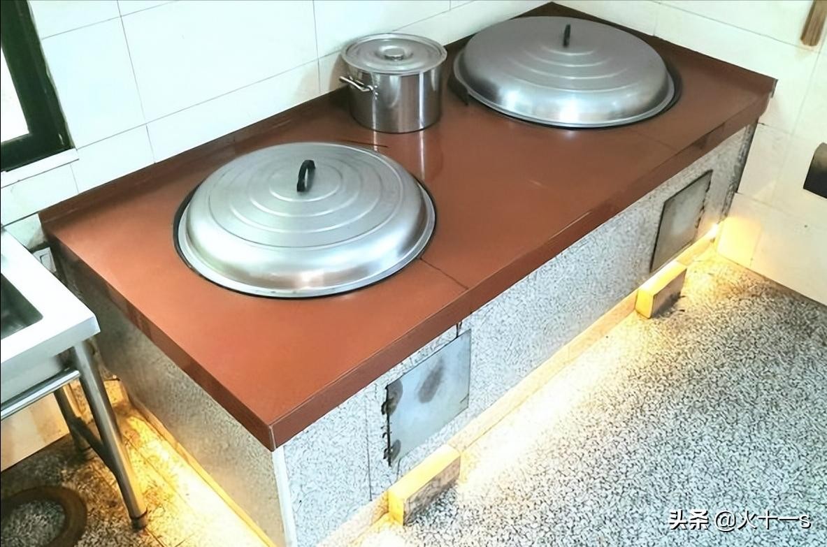柴火灶出烟口设计在在灶体中部靠墙处开孔,左右两边大小锅位相互独立 、互不影响。中部热水锅位利用底部通过的烟气余热进行加热,烟气经此锅位排向烟囱通道。