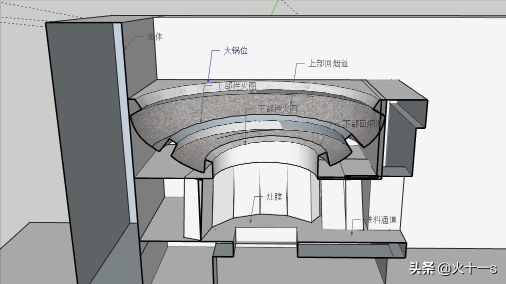 二者其实是一体的,只是需要分开描述同一个东西罢了。拦火圈分上部拦火圈和下部拦火圈,回烟道也是这样分的。这里重点介绍下部拦火圈。由于锅位偏移灶膛中心,导致下部拦火圈靠近出烟口这侧往下倾斜了一定角度,这一侧比对面那侧的回烟道立体空间更大。对侧拦火圈和回烟道所占表面积更小的情况下,于是在工艺要求上设置了一个最低值,也就是控制铁锅直径的最小值为54cm,避免回烟道空间过于狭窄,直到不适合做两个拦火圈。