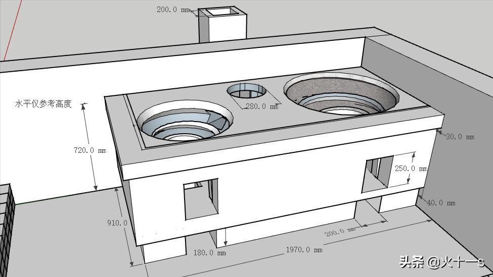 这里指大小锅位有左右之分,但首先要看灶体是否靠墙,从而影响到灶体底座放样尺寸的不同,也使大小锅的位置有所不同。如果一侧靠墙,从墙边到该锅位进风道中心线距离比不靠墙那侧到进风道中心线少5cm。不过根据个人使用情况,使用频次多的小锅位通常靠近窗户或旁边的水槽,并安排在灶体左侧不靠墙,方便使用。