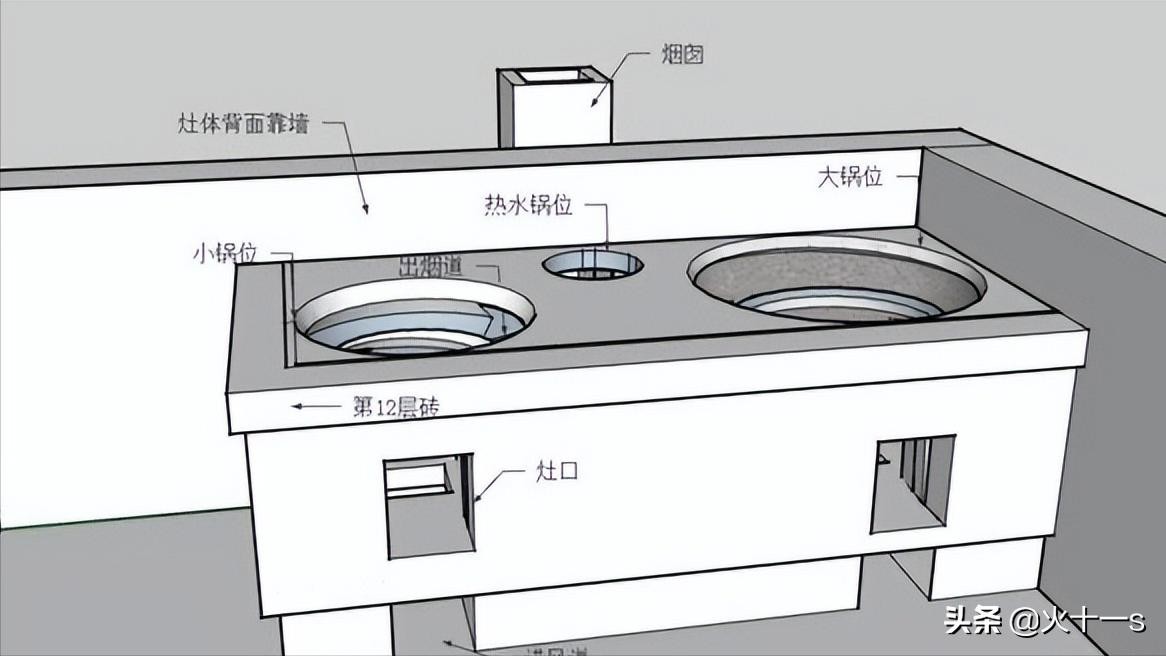 屋内靠墙 :常见形式是烟囱占用热水锅位,把热水锅位改到外侧。也可以把灶体在原放样尺寸基础上,整体往外移动一个烟囱宽度再靠墙砌烟囱,不过灶面就有1.3米宽了,这样太大且不便清扫。
