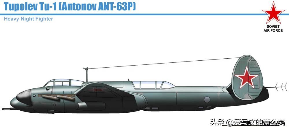 ANT-63P(后缀字母表示Perekhwatchik “拦截机”),别名Tu-1,是ANT-61(图-2S)轰炸机的的变种机型,旨在生产一种配备雷达的三座远程夜间全天候战斗机,也适用于护航任务。计划安装两台1900马力的Mikulin AM-39F 12缸液冷发动机,配备四门23毫米机关炮(翼根2、机身下2),机头容纳基于德国FuG 220的PNB-1 Gneiss-1机载拦截雷达。