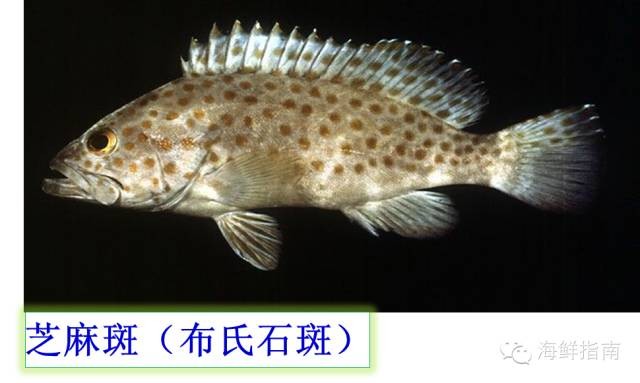 布氏石斑头部及体侧由淡褐色、红褐色或紫灰色组成,其上密集布满了如芝麻般的橘红色、金黄色或黄色斑点;背鳍及尾鳍上方也具有斑点,尾鳍下方则呈暗色。胸鳍上有小黑点,尾鳍的边缘有鲜明的白边。幼鱼有7条不明显的暗带,前2条在颈部,最后1条在尾柄上,芝麻斑适宜的生长水温为24-30℃。