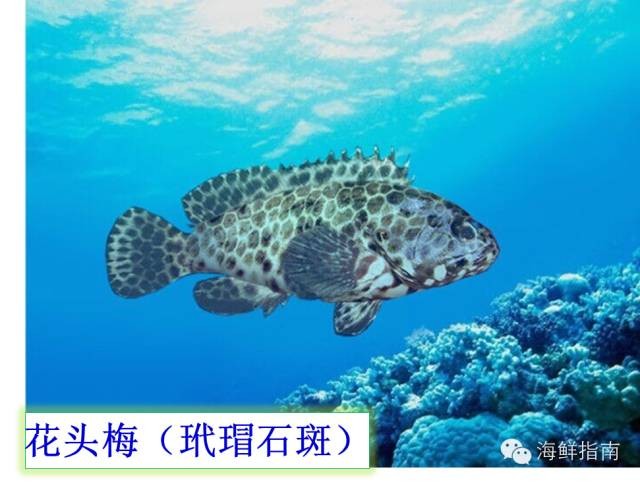玳瑁石斑呈黄棕色,各鳍灰白色;全身密布如玳瑁般不规则的六角形或圆形深棕色龟裂斑纹,斑点红棕色或黑色。灰白色间隔区狭窄形成网状图案,腹部的斑点独立且边缘分散;胸部有两条深棕色带,于胸鳍的基底下方融合,在腹侧形成一块灰白色区域。臀鳍和尾鳍的边缘与腹鳍的前沿有白色线状条纹及较宽的黑色带;胸鳍颜色较暗,带有深色不明显的斑点,花头梅适宜水温23-29℃。
