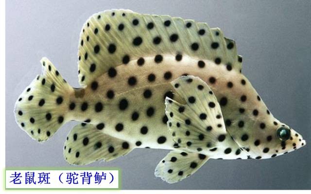 驼背鲈身体扁平,头顶凹入,背部高耸隆起,头小口大;体表和各鳍从白色至褐色呈可变体色,通常为褐色。体侧具有8个从无色至深褐色可变色的大斑块。因头长嘴尖,形状酷似老鼠而得名老鼠斑。头部、身体和各鳍布满黑色圆点,尾鳍圆形,各鳍与体同色。幼鱼体呈白色,无褐色斑块,身上散布黑色斑点,如同斑点狗。其胸鳍较大,游泳时前后飘摆,形似蝴蝶在舞蹈。随着生长,体色逐渐加深,黑色斑点变小变密。