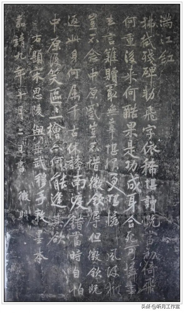 明代书法家严嵩《满江红》嘉靖九年,严嵩在杭州西子湖畔岳飞庙旁书写《满江红》。行书写就,结体紧凑,点画潇洒,字势开张,有黄庭坚书法之韵味,展现出豪迈气势。原文为文征明所作,揭露宋高宗谋害岳飞真相。由严嵩书写并立于岳飞墓前,形成强烈讽刺。后有人将碑文上“严嵩”之名刮去,代之以文征明。此碑文不仅词意慷慨,书法亦秀丽可观,展现了严嵩的书法才华。