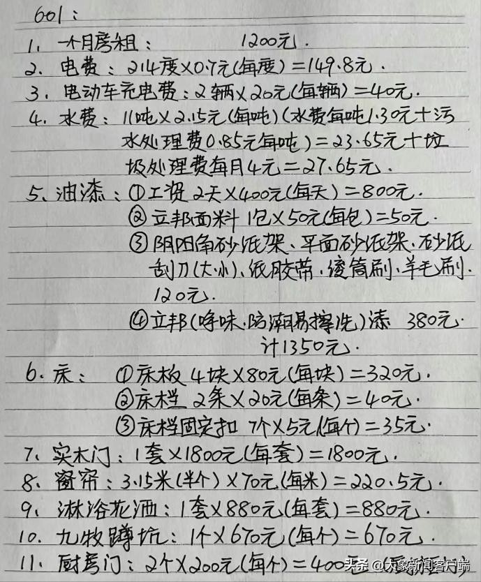 据小陈所述,她因孩子上学需要,在玉山县城东小学附近租住了一处自建房。然而,在退租之际,房东却以极其严格的标准对房屋进行了检查,从墙壁到床、橱柜、门框等细节均不放过,并贴上了黄色标记。随后,房东列出了一份详细的赔偿清单(清单显示月租金为1200元),列出了油漆、床、实木门、窗帘、蹲坑、厨房门、外墙砖、地砖等需要支付的损伤补偿以及由此产生的工资,最后还有一笔2000元的“其他损伤补偿费”,合计10884.95元。小陈对此表示强烈不满,认为房东是在故意讹诈。