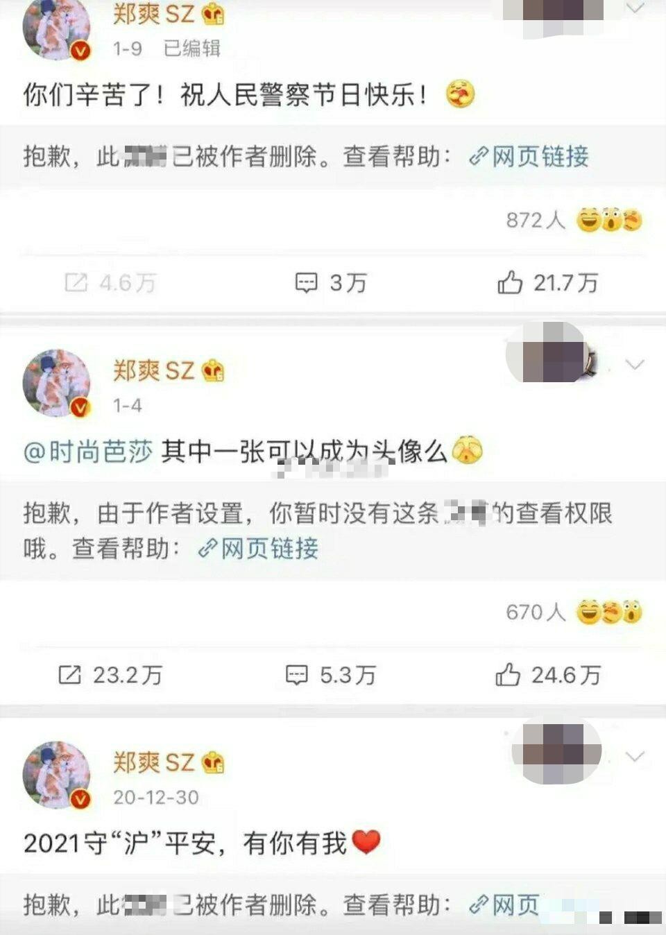 除了该大牌外,曾经和郑爽转发互动过的时尚芭莎、上海民警等官方账号纷纷删除了有关她的动态,以至于郑爽的首页一度都充斥着“抱歉,此动态已被作者删除”。
