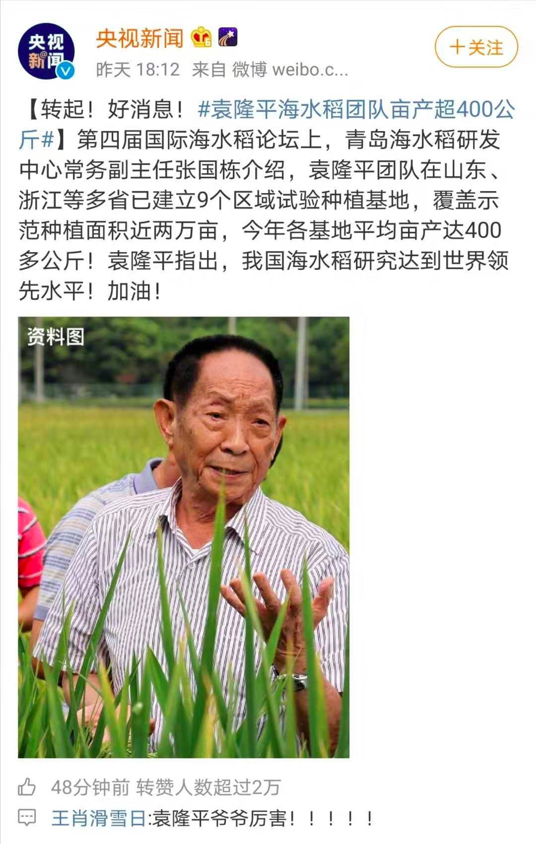 据中新网和新华社报道,一段时间以来,由袁隆平担任首席科学家的海水稻研究团队在山东、浙江等多个省份建立区域试验种植基地,示范种植海水稻近两万亩。据介绍,今年各基地平均亩产达400多公斤。