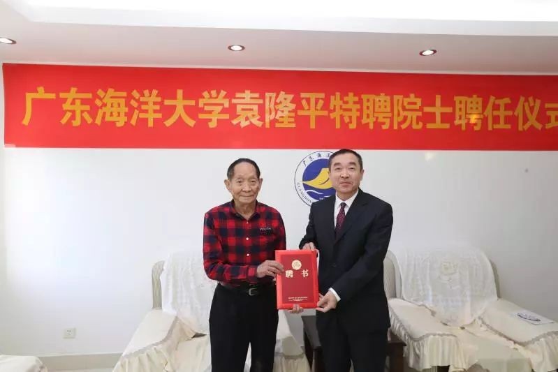 据广东海洋大学官微发布的消息,12月18日上午,袁隆平从广东海洋大学党委书记曹俊明手中接过鲜红的聘书,正式受聘为广东海洋大学特聘院士。
