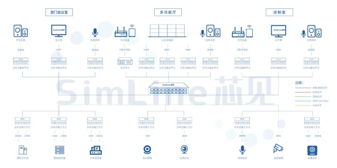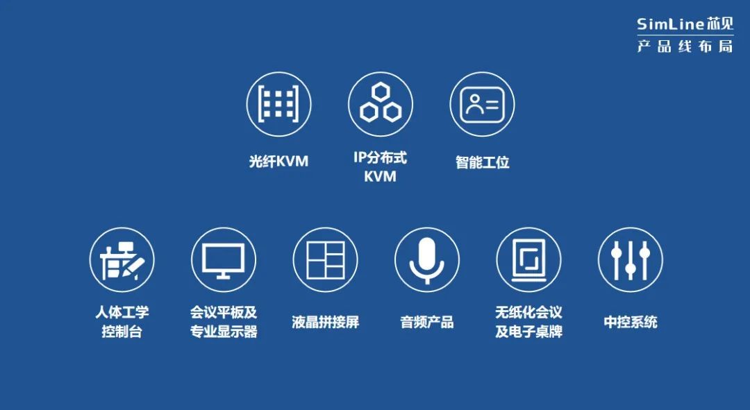SimLine IP分布式KVM产品集合了网络通信、音视频编解码、智能控制、语音控制等技术,实现了对音频、视频、大屏、环境等信号或设备的统一控制及管理,系统以可视化触控的交互方式,实现对整体设备的管控。