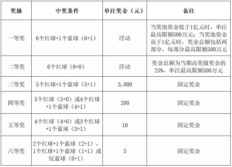 低奖级奖金分配:三等奖至六等奖为低奖级,奖金为固定金额。三等奖单注奖金固定为3000元,四等奖单注奖金固定为200元,五等奖单注奖金固定为10元,六等奖单注奖金固定为5元。