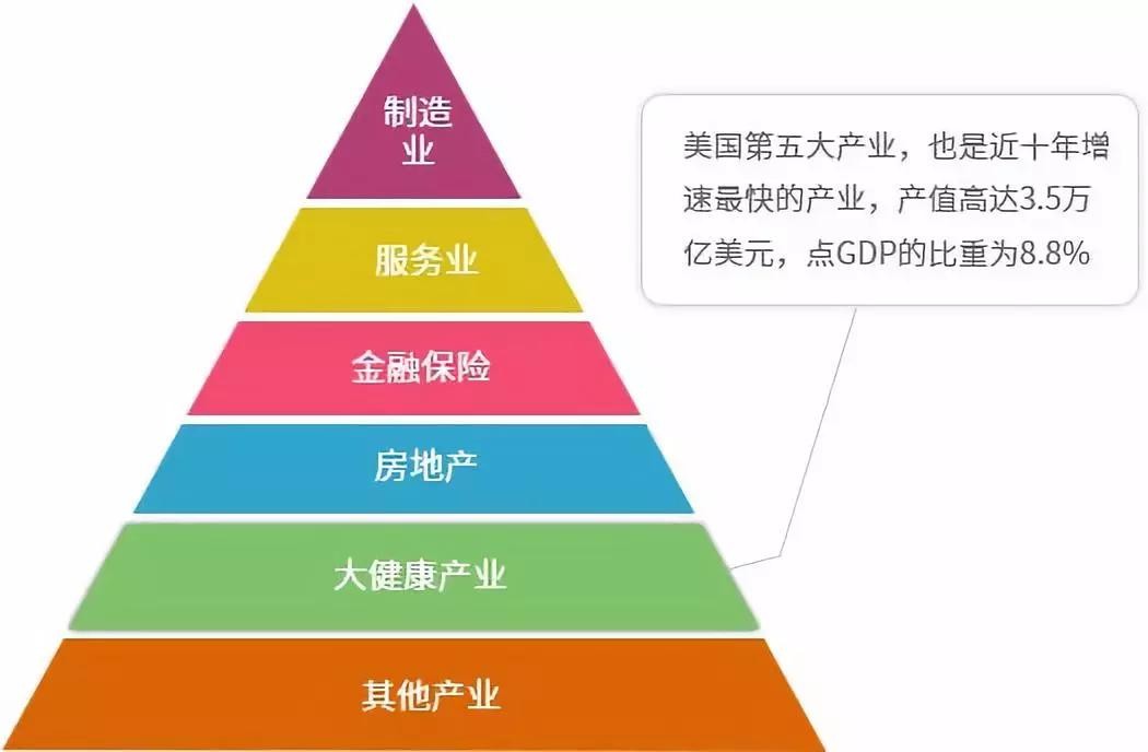 目前,起源于1963年的美国大健康产业,堪称近十年增速最快的产业,仅次于制造业、房地产业等大产业,尤其在美国2008年金融危机之后,可以说,健康产业已经成为美国经济的支柱产业。