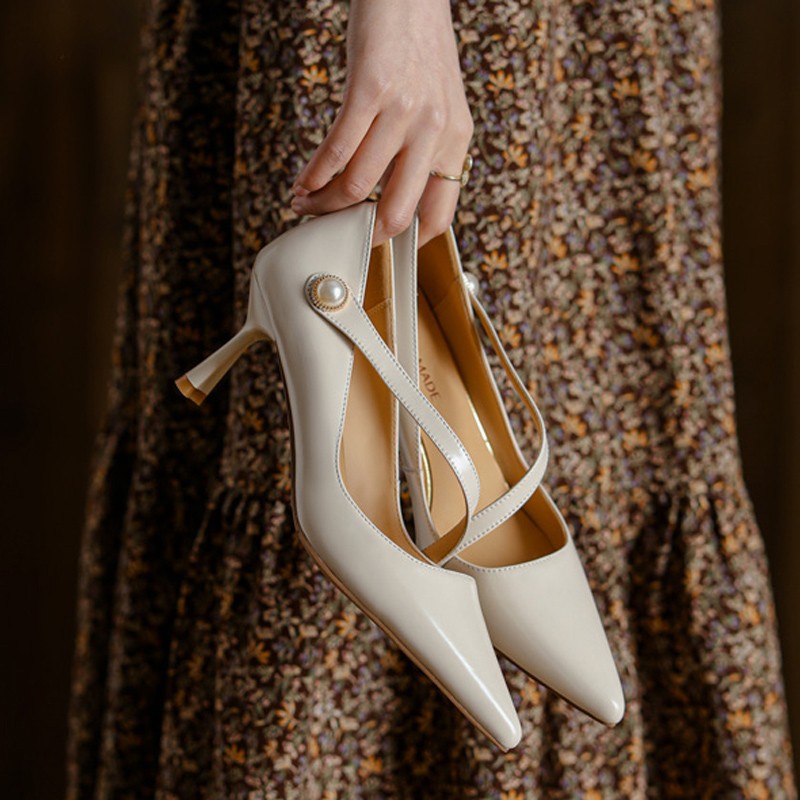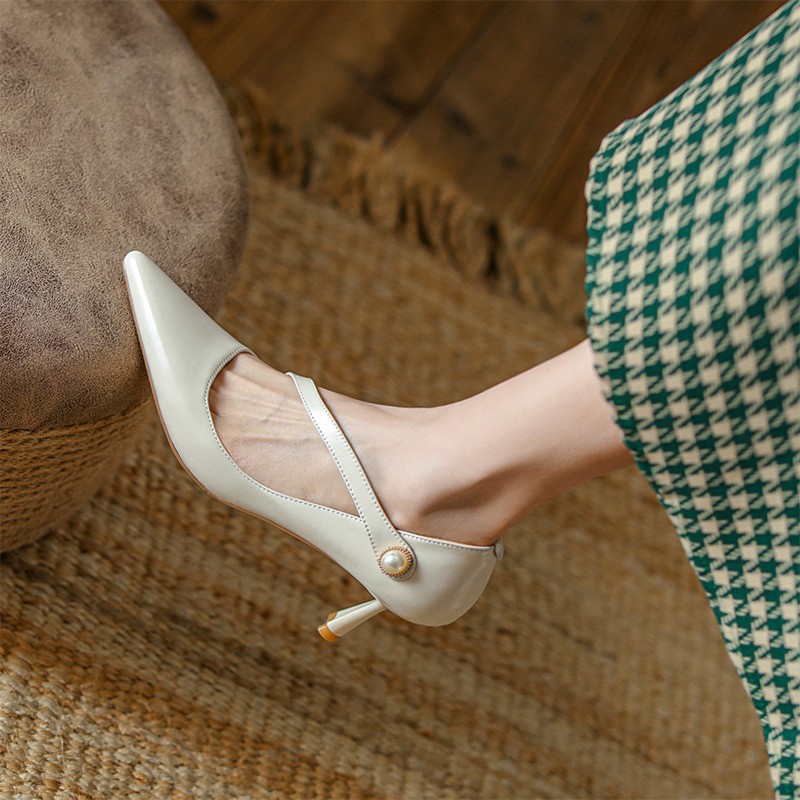 白色法式一字带高跟鞋
