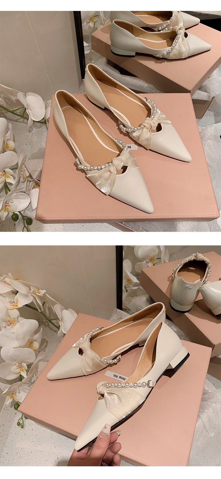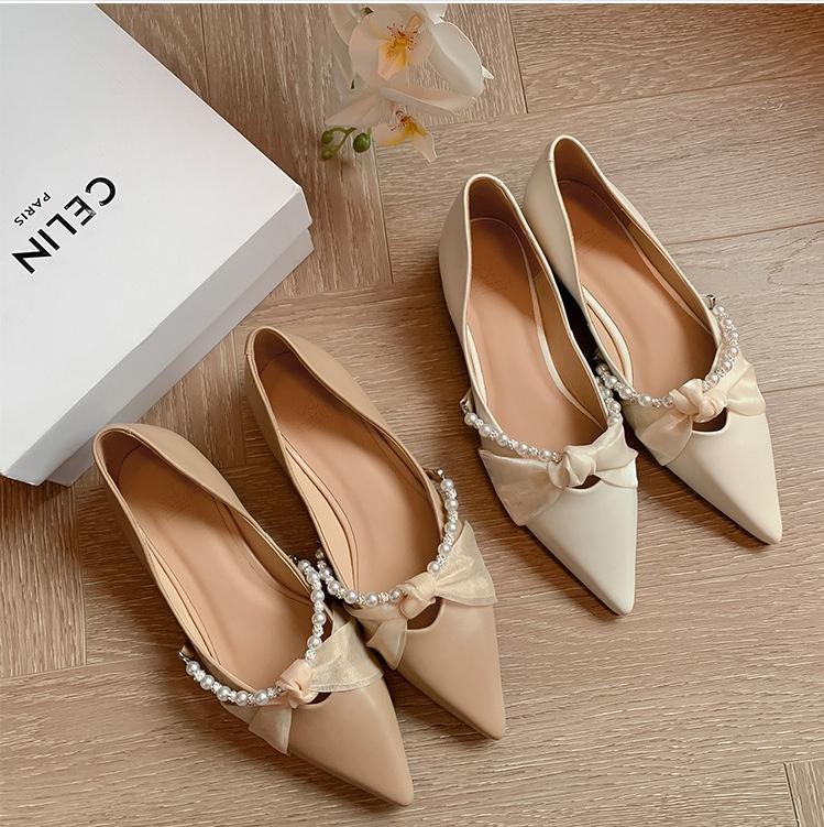 有一点仙气飘飘,有一点优雅迷人,这种浅口单鞋,你确定不来一双吗?珍珠网纱蝴蝶结,各种甜美清新的元素都有了,配色也非常舒服,奶咖和米白,配裙子真好看。