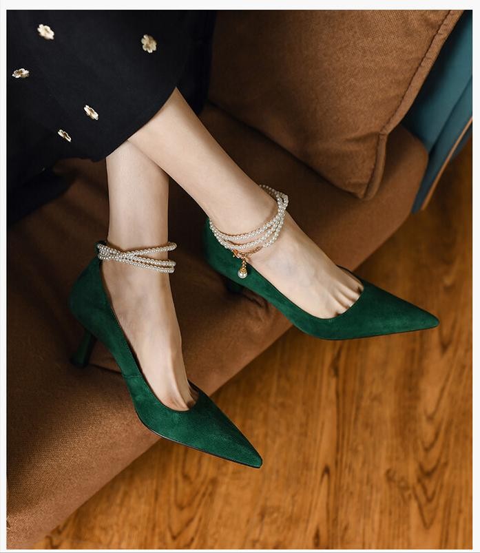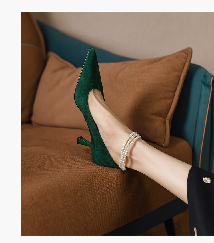 要说一双真正具有女人味的高跟鞋,看它第一眼我就着迷,珍珠脚踝作为绑带设计,不用担心掉跟,也非常具有高级感。加上绿色的牛反绒材质,还带有一点轻复古。鞋子是真皮的,轻便舒适,好穿不累。