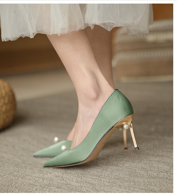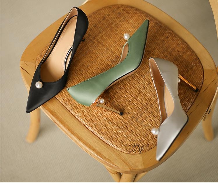 黑色的高跟鞋所具有的的气质感,真的很独特,加上尖头+细跟的组合,简直就是为职场女性而创造,珍珠点缀鞋口,形成一片叶子的形状,更加显得生动和迷人。