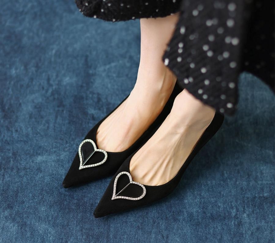 推荐这双鞋子,我真的太喜欢这个爱心扣了,让这双鞋子都充满气质感和高级感,饰扣是小颗的细钻点缀,黑色的款式材质是反绒皮的,春秋都可以穿。