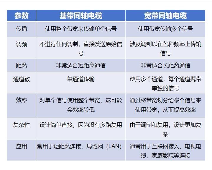 基带同轴电缆可以用于模拟信号和数字信号,每次以极高的速度传输单个信号,而且整个基带带宽都用于发送单个信号。基带同轴电缆的屏蔽层一般是铜制成的网状结构,特征阻抗是50Ω,常见的种类比如RG-8、RG-58。