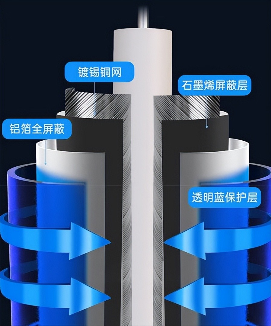 同轴线的中心导体传输的高频率电流,可以看作是一根向外发射无线电的天线,本质上属于一种“交流电”。回想一下初中物理知识,“交流电的方向会呈周期性改变,一秒内会发生多次逆转。”而为了减少电流方向不确定性带来的影响,同轴线的设计中加入了“网状导电层隔离”,也就是屏蔽层,它可以通过接地的方式控制中心导体发射出来的无线电。