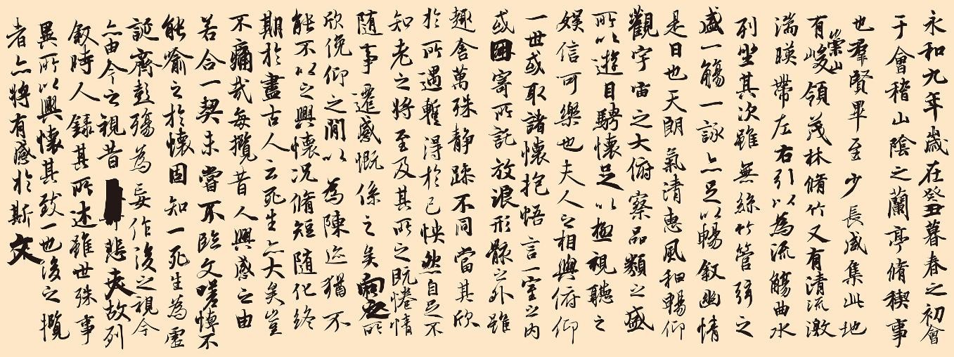 《兰亭序》即《兰亭集序》又名《兰亭宴集序》、《临河序》、《禊序》和《禊贴》。东晋穆帝永和九年(公元353年)三月三日,王羲之与谢安、孙绰等四十一位军政高官,在山阴(今浙江绍兴)兰亭“修禊”,会上各人做诗,王羲之为他们的诗写的序文手稿。《兰亭序》中记叙兰亭周围山水之美和聚会的欢乐之情,抒发作者对于生死无常的感慨。
