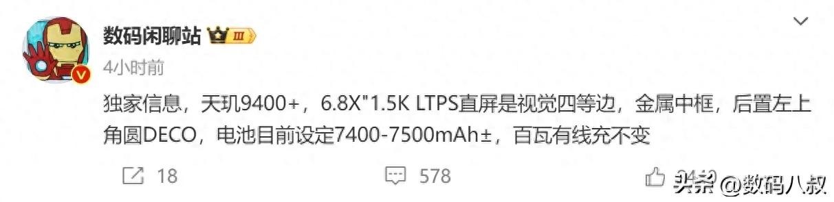 • 续航增强:电池容量大幅提升至7400~7500mAh,支持百瓦有线快充,结合1.5K屏幕的较低功耗,续航将有显著提升。不过,预计仍不支持无线充电。