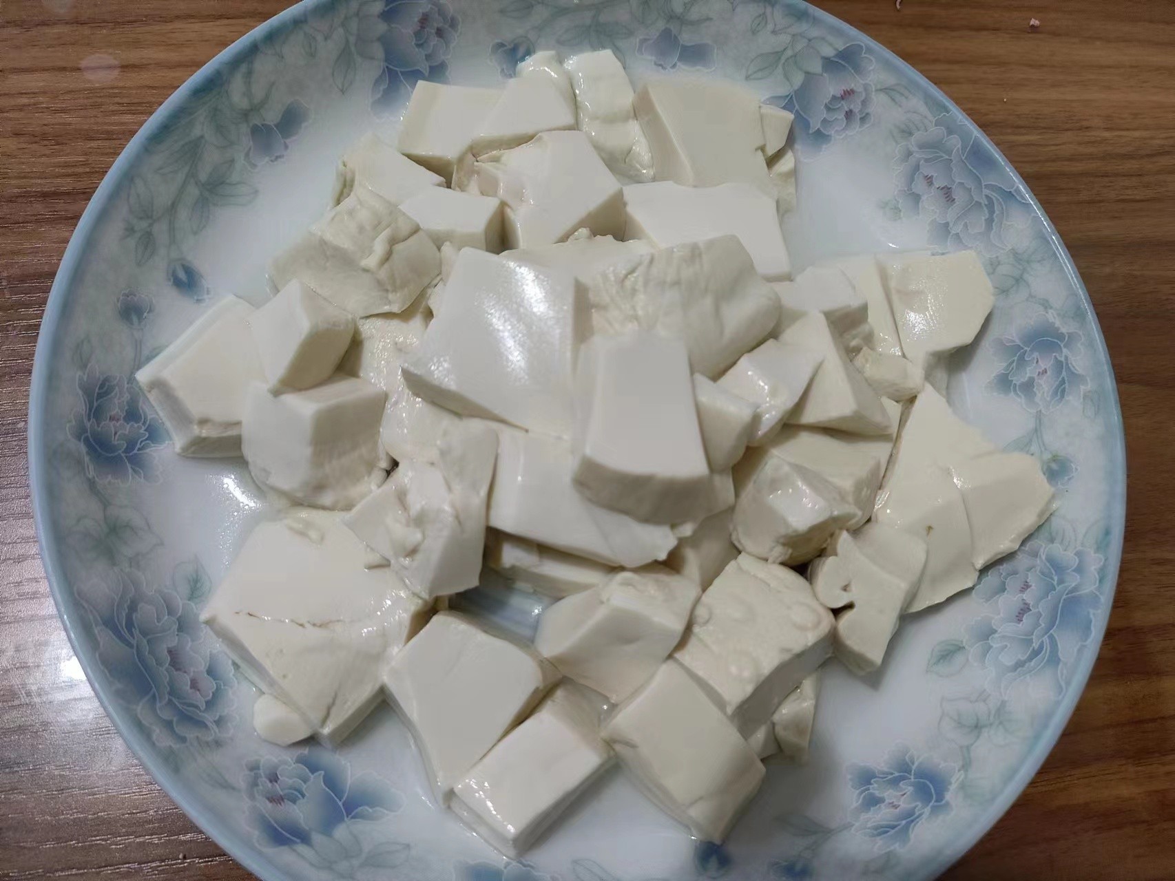 1.豆腐切小块,焯水,焯水时水中放一点盐。
