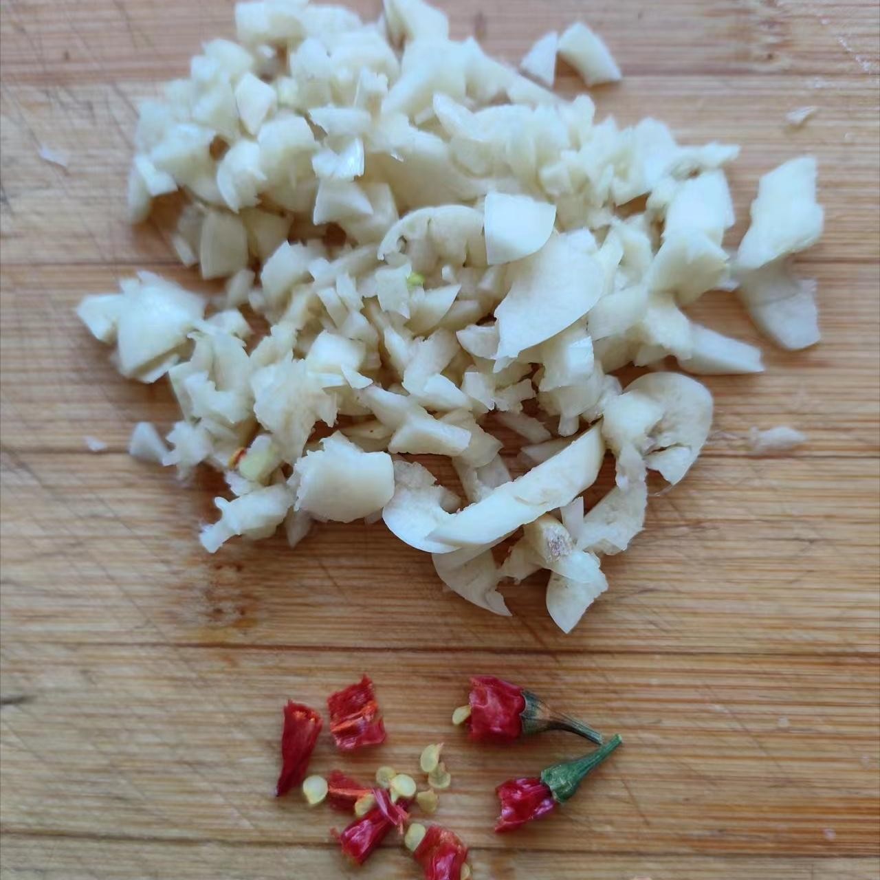 2.蒜切末,辣椒切小段。