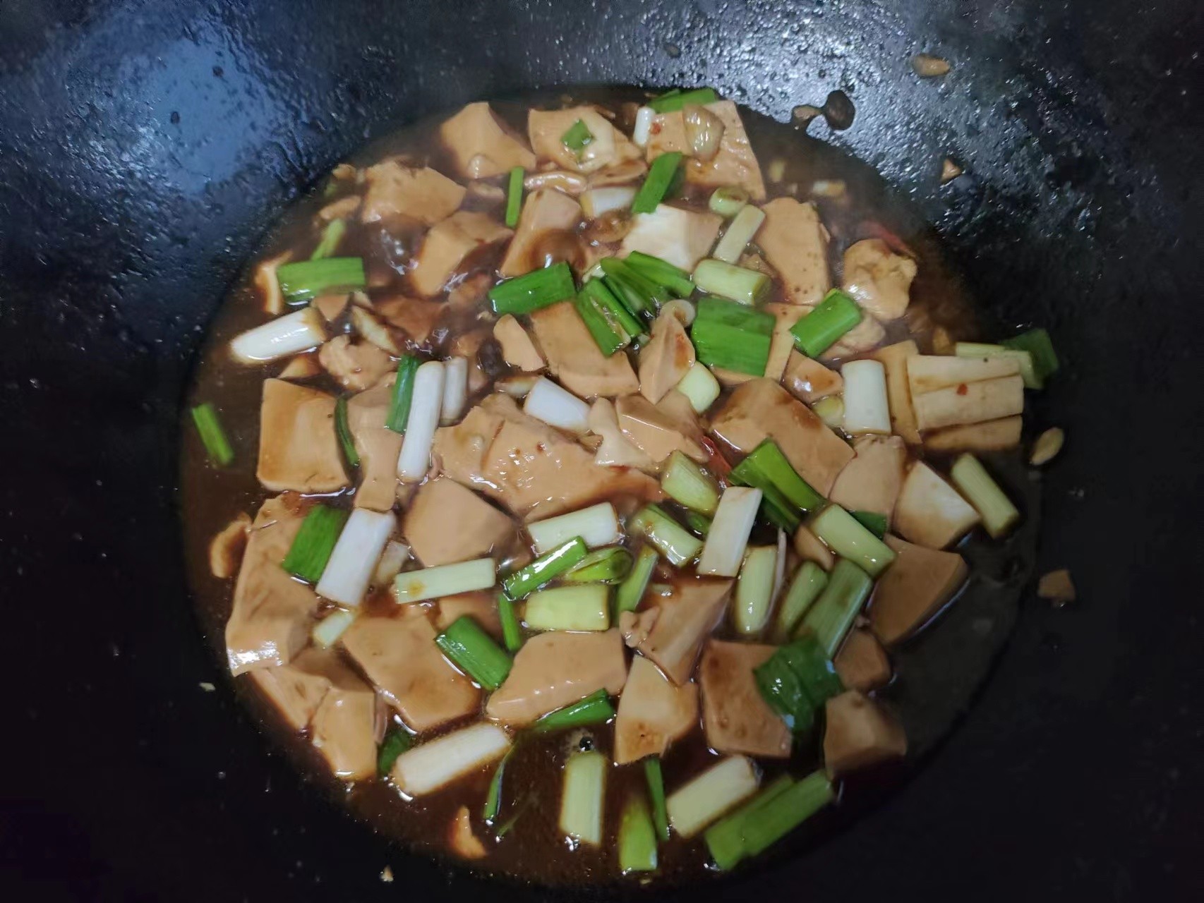 6.放入蒜苗,翻炒一下。